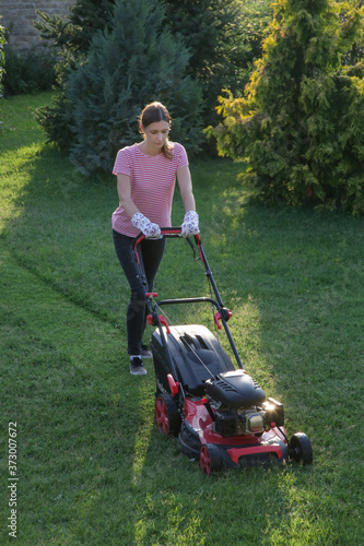© triocean, Fototapeta premium Young woman cutting grass with a lawn mower. Outdoor household chores concept.