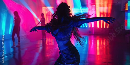 © Brian, Fototapeta premium Young woman dancing at a rave - black light and colors as electronic dance music (EDM) plays