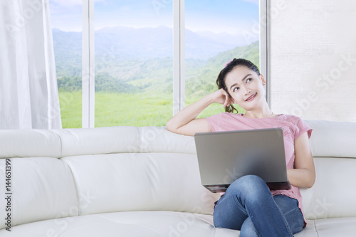 © Creativa Images, Naklejka premium Young woman daydreaming on sofa