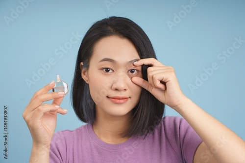 © Timeimage, Obraz premium Young woman demonstrates contact lens application technique while smiling against a blue background