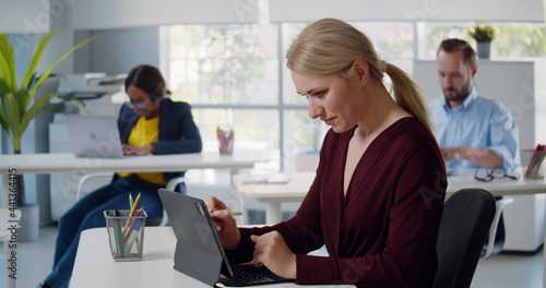 Obraz premium Young woman designer using graphic tablet sitting at workplace in creative office.