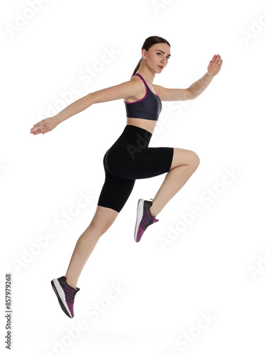 Fototapeta premium Young woman doing aerobic exercise on white background
