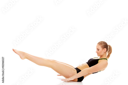 © Piotr Marcinski, Obraz premium Young woman doing exercise on the floor