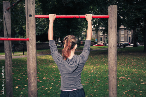 © LoloStock, Fototapeta premium Young woman doing pullups in the park