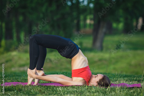 Fototapeta premium Young woman doing yoga exercises in the summer city park. Health lifestyle...
