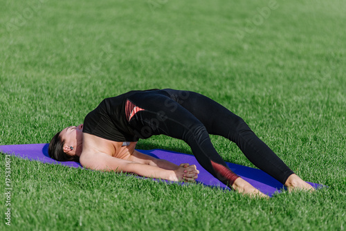 © sergo321, Fototapeta premium young woman doing yoga in the park in the morning in autumn.