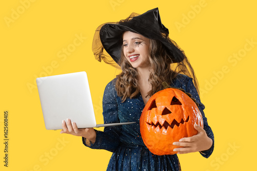 Fototapeta premium Young woman dressed as witch for Halloween with pumpkin and laptop shopping online on yellow background