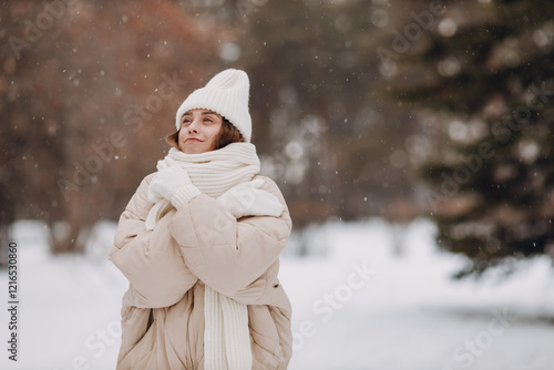 Obraz premium Young woman dressed coat scarf hat and mittens and winter weather at snowy winter park