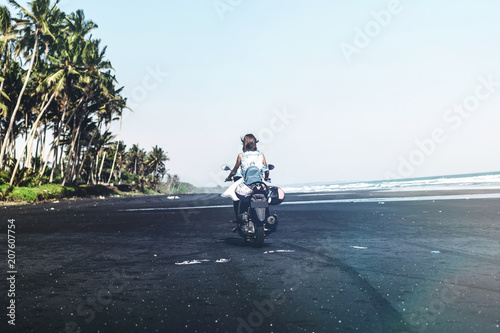 Obraz premium Young woman driving a scooter at the beach with black sand. Bali island.