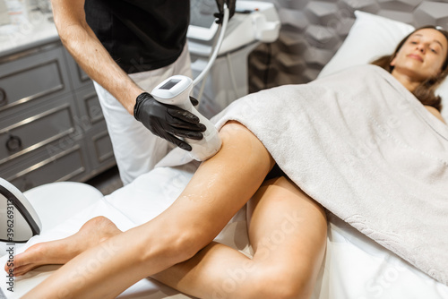 © rh2010, Fototapeta premium Young woman during an ultrasound liposuction procedure at luxury Spa salon. Doctor working on thigh area