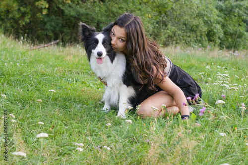© Evgeniia, Obraz premium Young woman embracing Border Collie dog in meadow, leaning in with affection. Ideal for pet love themes, canine companionship visuals, and natural lifestyle portrait photography