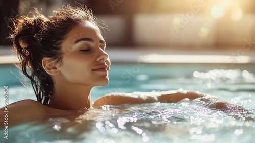 Fototapeta premium Young woman enjoying a relaxing moment in a serene pool under warm sunlight...
