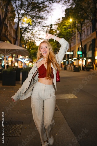 Fototapeta premium Young woman enjoying city night life in Vienna