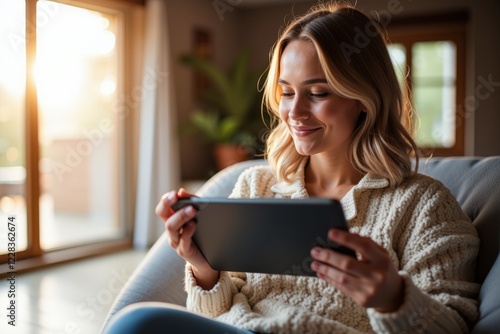 Fototapeta premium Young Woman Enjoying Leisure Time at Home While Watching Content on Her Tablet in a Warm, Inviting Living Room with Natural Light and Cozy Atmosphere