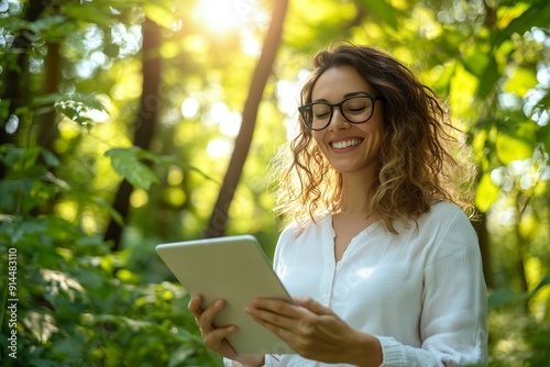 © fotofabrika, Obraz premium Young Woman Enjoying Nature While Using Tablet in Lush Green Forest During Bright Afternoon