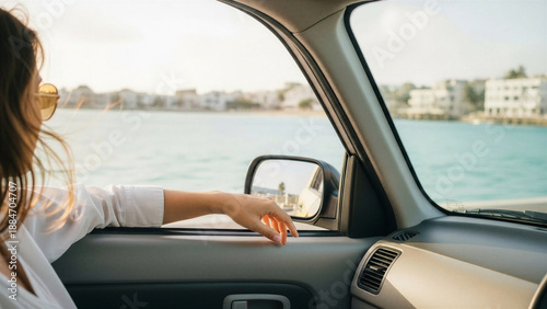 © Ekaterina, Naklejka premium Young woman enjoying seaside view from car window during summer