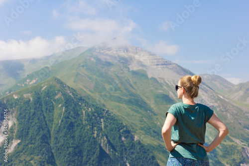 Naklejka premium Young woman enjoys the clean air in the mountains. Tourist girl.