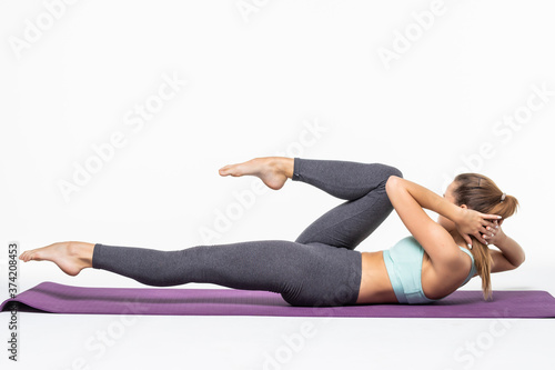 Fototapeta premium Young woman exercising and doing a crunch to work her abs isolated white...