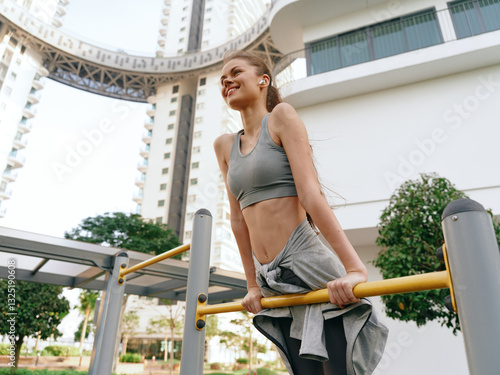 Fototapeta premium Young woman exercising outdoors on bars with a joyful expression in an urban...