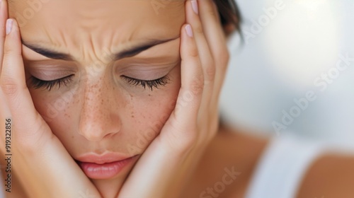 Fototapeta premium Young Woman Experiencing Stress With Hands on Face in Bright Room During...