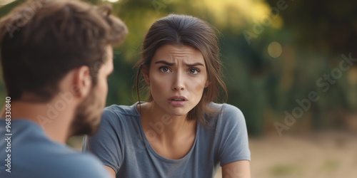 Fototapeta premium Young woman feeling confused while talking with man outdoors
