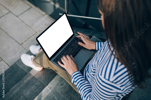 © polinaloves, Naklejka premium Young woman freelancer working online using her laptop, sitting on stairs.