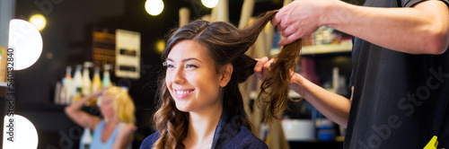 © Solid photos, Fototapeta premium Young woman getting new hairstyle from hairdresser in the modern hair salon