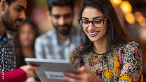 © Panida, Obraz premium Young Woman Glasses Is Looking Tablet Computer, While Two Other Men Look On. They Appear Be Collaborating Project Discussing Information Displayed Tablet.