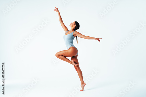 © chaossart, Obraz premium Young woman gymnast stretching on white background