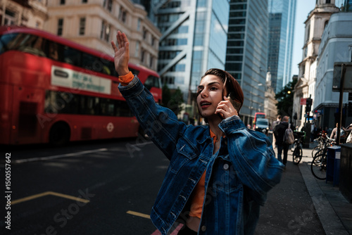 Fototapeta premium Young woman hailing taxi while talking on phone in london