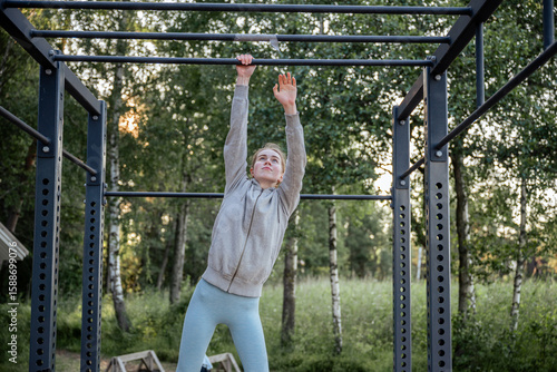 © AnastasiiaAkh, Fototapeta premium Young woman hanging on pull-up bar at outdoor gym in park