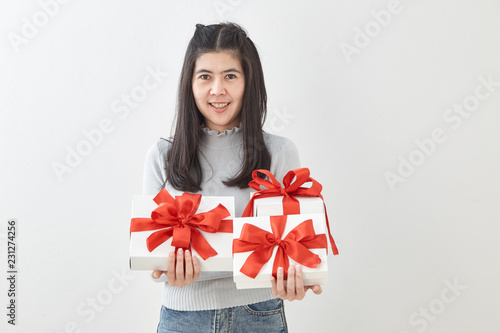 © 1981 Rustic Studio, Fototapeta premium Young woman happy hold gift box in hands