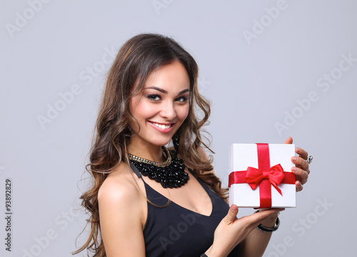 Fototapeta premium Young woman happy smile hold gift box in hands