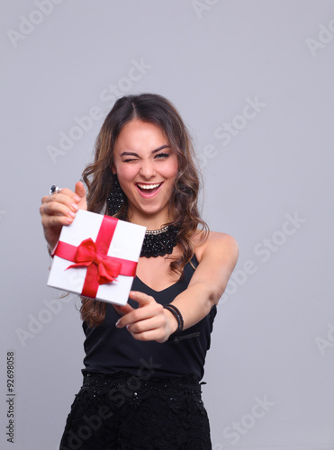 Fototapeta premium Young woman happy smile hold gift box in hands, isolated over