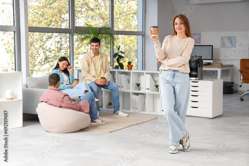 Fototapeta premium Young woman having coffee break in office