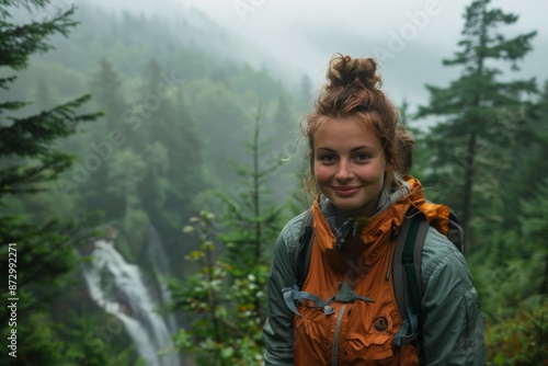 Naklejka premium Young Woman Hiking in Misty Forest hiking