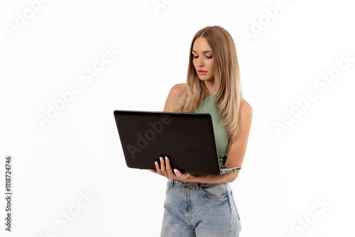 Naklejka premium Young woman holding a laptop in a casual outfit, engaging with technology...