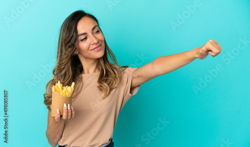 Fototapeta premium Young woman holding fried chips over isolated background giving a thumbs up...