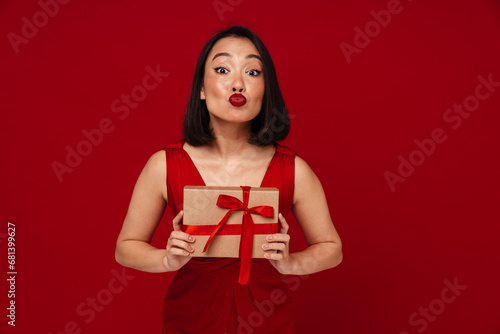 © Drobot Dean, Fototapeta premium Young woman holding gift box and making kiss lips isolated over red background