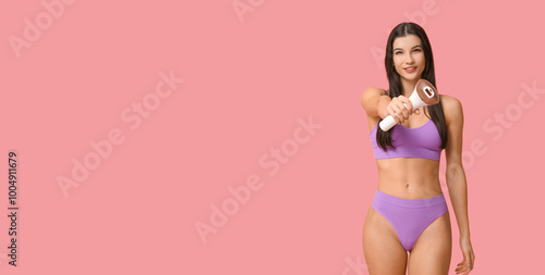 © Pixel-Shot, Naklejka premium Young woman holding modern photoepilator on pink background with space for text