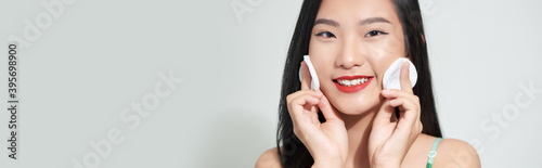 Fototapeta premium Young woman holding sponge in her hands isolated on white background