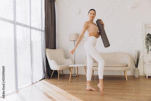 Fototapeta premium Young woman holding yoga mat preparing for home workout