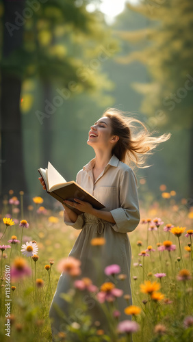 © Tamas, Naklejka premium Young Woman in a Forest with a Notebook