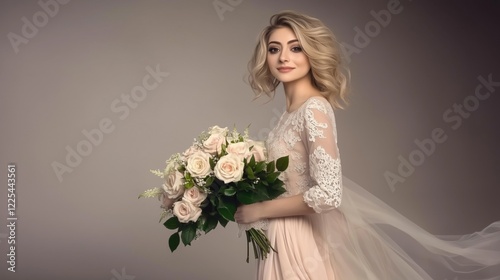 Fototapeta premium Young woman in a pastel spring dress holding a bouquet of roses during a soft-lit photoshoot
