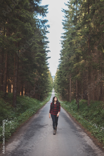© Fauren, Fototapeta premium Young woman in a red plaid shirt walking down a peaceful, tree-lined forest road, embracing the tranquility and beauty of nature, symbolizing freedom and a journey of self-discovery