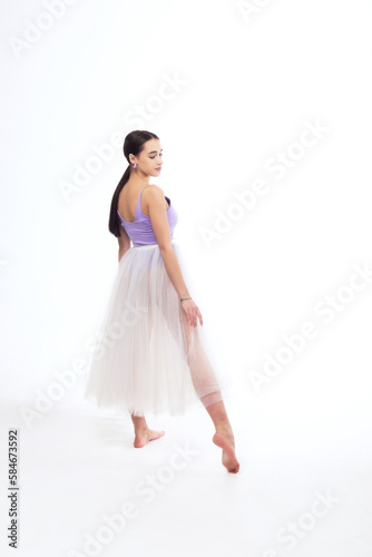 © Eno1, Naklejka premium Young woman in a tulle skirt posing on a white background