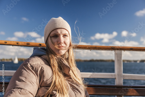 Obraz premium Young woman in a warm jacket and knit hat sitting on a boat on a sunny windy day over Lake Ontario in Toronto, Canada