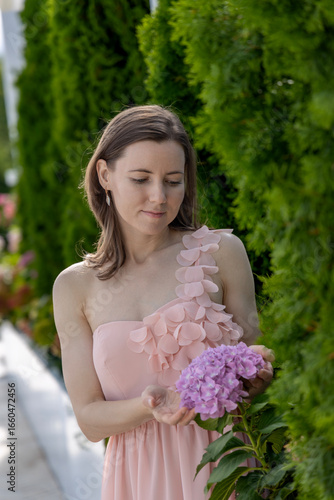 © night87, Fototapeta premium Young woman in an elegant light pink dress with floral details gently holding a blooming purple hydrangea, standing beside lush green bushes in a summer garden
