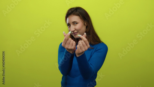 Fototapeta premium Young woman in blue sweater making heart gesture with fingers against a bright yellow background, smiling joyfully in an isolated setting, capturing playful expression.