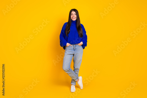 Fototapeta premium Young woman in blue sweater posing confidently against bright yellow background